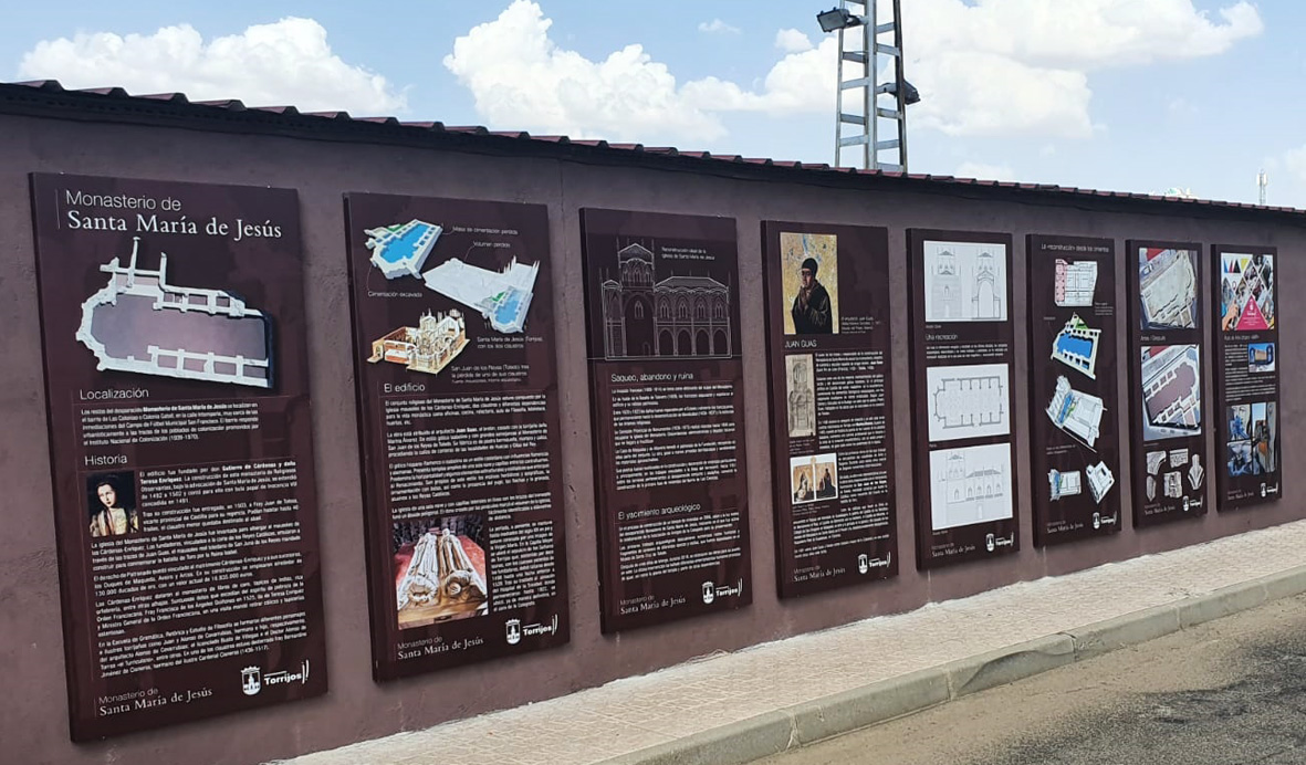 El yacimiento arqueológico del antiguo monasterio de Santa María de Jesús, localizado en el barrio de “Las Colonias” de Torrijos ha acogido la instalación de 8 nuevos paneles interpretativos. La instalación de los paneles, se suman también a las dos pinturas murales de grandes dimensiones que se inauguraron a principios de este año junto al citado conjunto arqueológico, en el marco del programa municipal de arte urbano “Más Allá dela Pared”, pinturas que ilustran tanto a Teresa Enríquez como una vista de cómo fue el antiguo monasterio. Para finalizar la administración torrijeña ha querido posibilitar, con estas últimas intervenciones, que dicho conjunto pueda ser conceptuado positivamente por los visitantes que se acercan hasta su emplazamiento en la calle Intemperie del barrio de “Las Colonias” y, por tanto, convertirlo en un auténtico recurso turístico más para la villa.