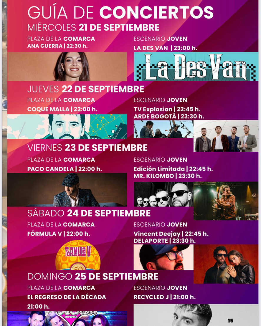 Por lo que respecta al sábado, 24 de septiembre, Fórmula V estará en la Plaza de la Comarca con su gira ‘50+1’, y en el Escenario Joven actuará el dúo de electropop Delaporte y Vincent Deejay de telonero. El domingo, 25 de septiembre, los conciertos cerrarán con ‘El regreso de la Década’ en la Plaza de la Comarca y Recycled J en el Escenario Joven.