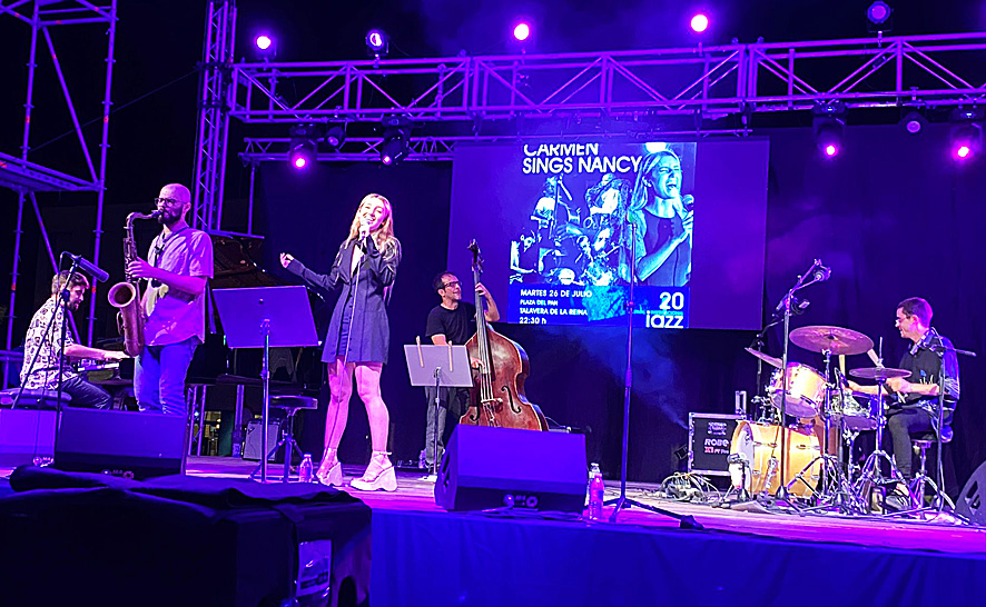 El concejal de Promoción Cultural, Carlos Gil y el presidente de la asociación ‘Always Elvis’. Bene Tapetado, han acompañado en la primer noche a Mingo, Sanpa & Bárez Bros en el concierto gratuito que se celebró sobre el gran escenario de la Plaza del Pan, con la asistencia de más de 600 personas entregadas al ritmo del blues de esta banda formada por Mingo Balaguer (voz y armónica), Pablo Sanpa (guitarra), Sergio Bárez (bajo) y Pablo Bárez (batería), uniendo a dos generaciones del blues de este país. Por una parte, Mingo Balaguer, consolidado como uno de los máximos exponentes en la armónica de blues a nivel nacional y europeo, y el guitarrista Pablo Sanpa, como referente nacional en cuanto a la guitarra eléctrica de blues se refiere, junto a los hermanos Sergio y Pablo Bárez. Los conciertos continúan y anoche era el turno del grupo Carmen Sings ‘Nancy Wilson’. Un concierto muy personal y donde la parte instrumental ha tenido un protagonismo ineludible. Continuarán el miércoles con María Toro, el jueves con Alain Pérez Quintet, el viernes Leganés Big Band & Noa Lur y el cierre, el sábado, con Wafa Oudjit.